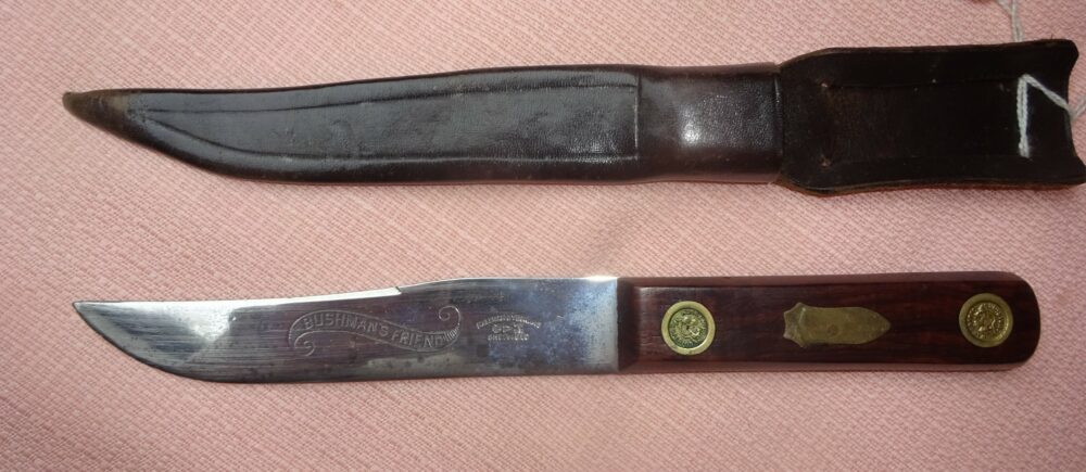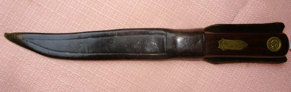 COUTEAU DE CHASSE ANGLAIS, longueur totale 23 cm,lame acier marquée : BUSHMAN’S FRIEND avec le nom du fabricant à SHEFFIELD sans aucune piqûre,manche à plaquette en bois avec rivets laiton décorés et marqués GARANTED SUPERIOR avec incrustation d’un écusson, fourreau en cuir marron en superbe état de conservation, couteau de chasse exporté aux US dans les années 1890/1910.