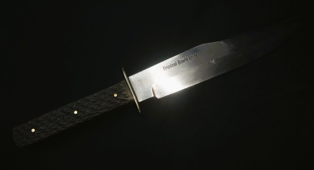 BOWIE KNIFE d’origine allemande, marqué : ORIGINAL BOWIE KNIFE numéroté 37HSI et de l’autre côté de la lame SOLINGEN GERMANY, lame acier en superbe état, sans aucune corrosion, garde en acier, manque à plaquette en bois grainé, longueur totale 32,5 cm, longueur de la lame 20,5 cm.