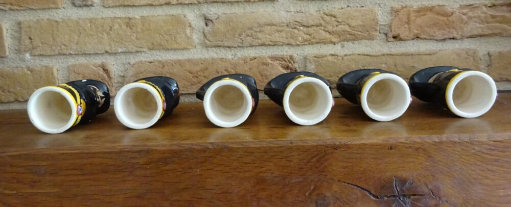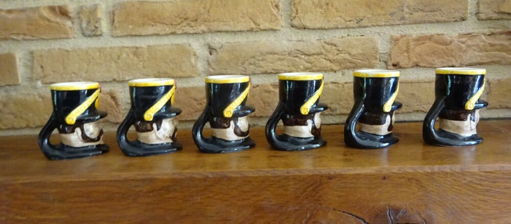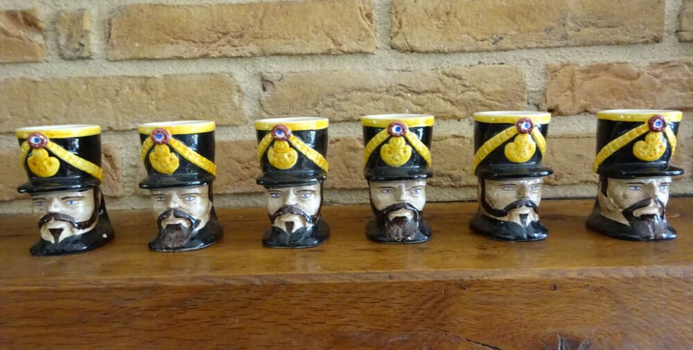 Série de 6 tasses à eau de vie, en céramique, en parfait état (aucun éclat), représentant des soldats coiffés de leur shako, série amusante pour collectionneur de cette époque, hauteur 7 cm.