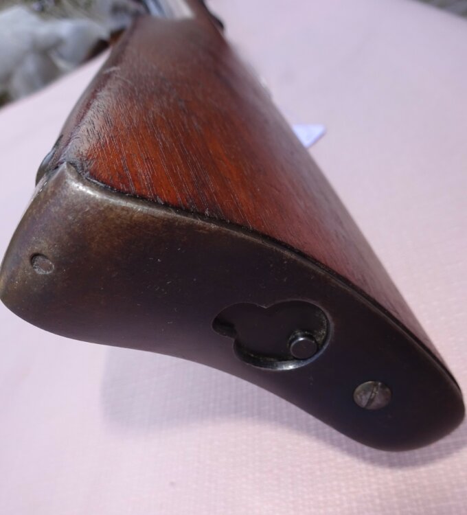 Carabine de selle model 1895, calibre 30/06 gouvernement (beaucoup plus rare que le 30/40 krag), canon rond de 22″ à l’intérieur absolument neuf d’usine, l’arme retient 100% de son bronzage d’origine sur le canon et 90% sur le boîtier de culasse et le levier de sous-garde, les 10% restant ayant viré couleur tabac foncé à certains endroits, mécanique parfaite, aucun jeu de la culasse lorsqu’elle est ouverte, très beaux marquages et patents sur le côté gauche du boîtier de culasse, avec son anneau de selle ainsi que : 30 GOV 06 sur le dessus de celle-ci, toutes les vis sont état neuf, bois superbement ajustés sans aucun coup, plaque de couche avec logement pour baguette de nettoyage, arme sortie de manufacture en 1921, rare sur le marché dans cet état de conservation.