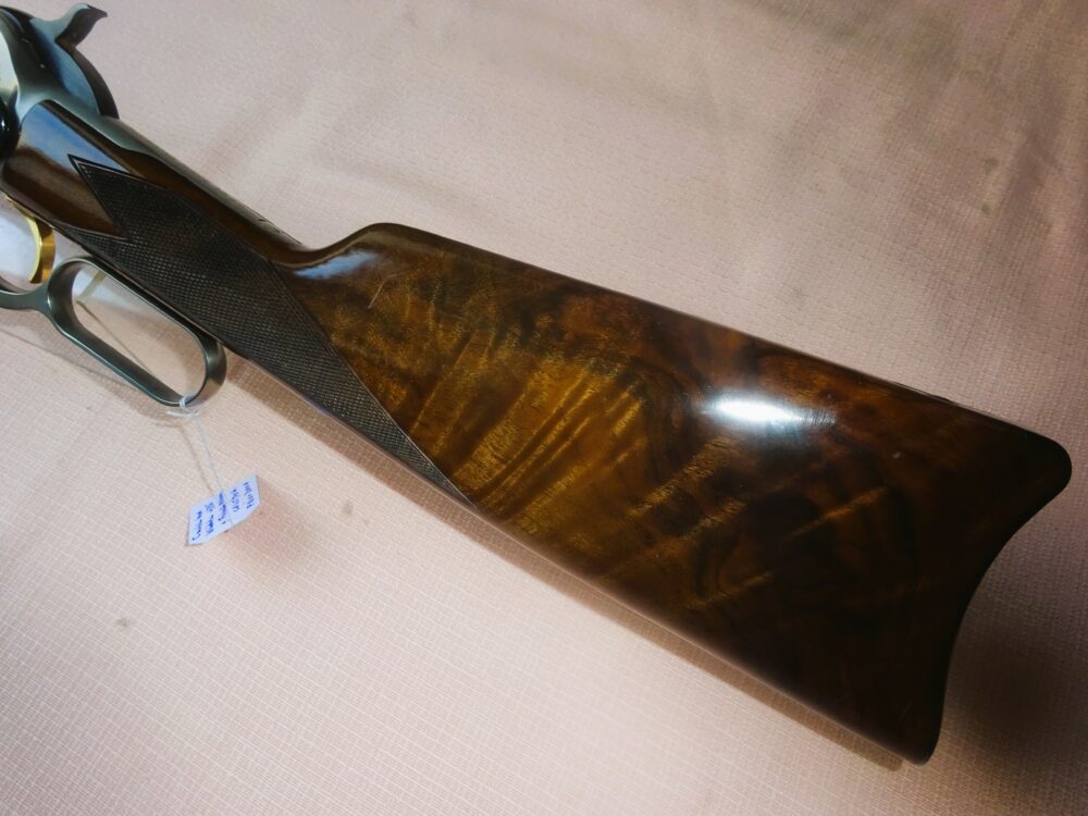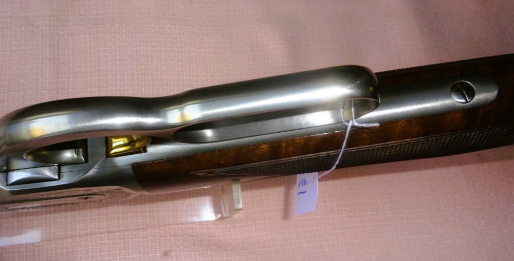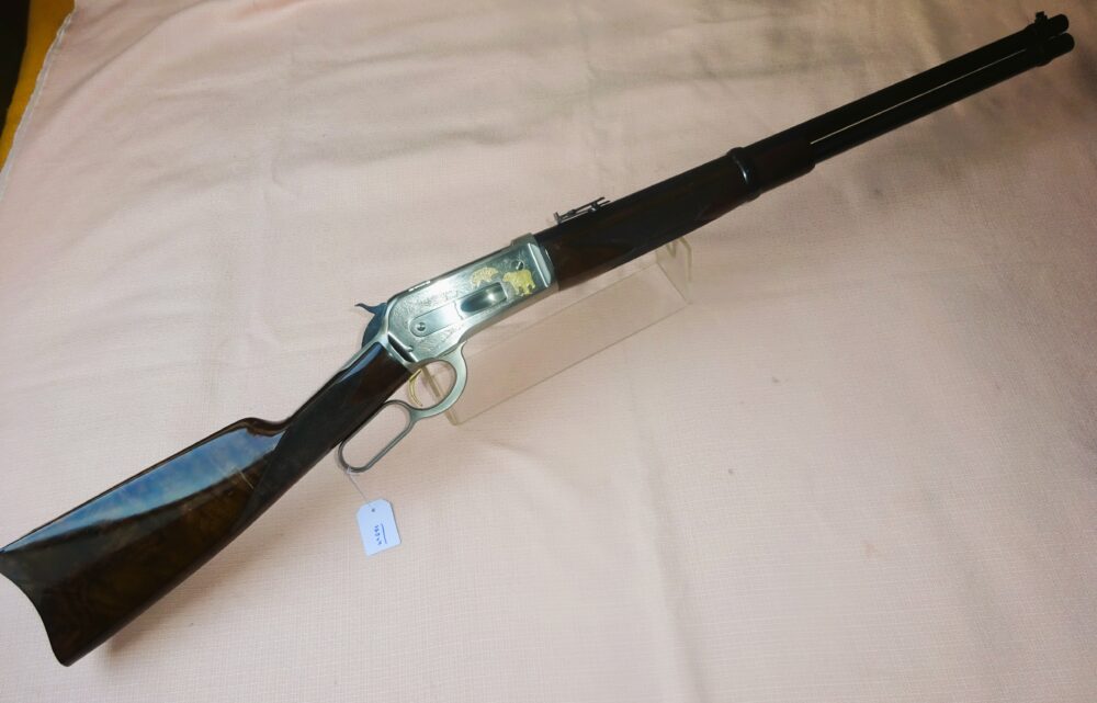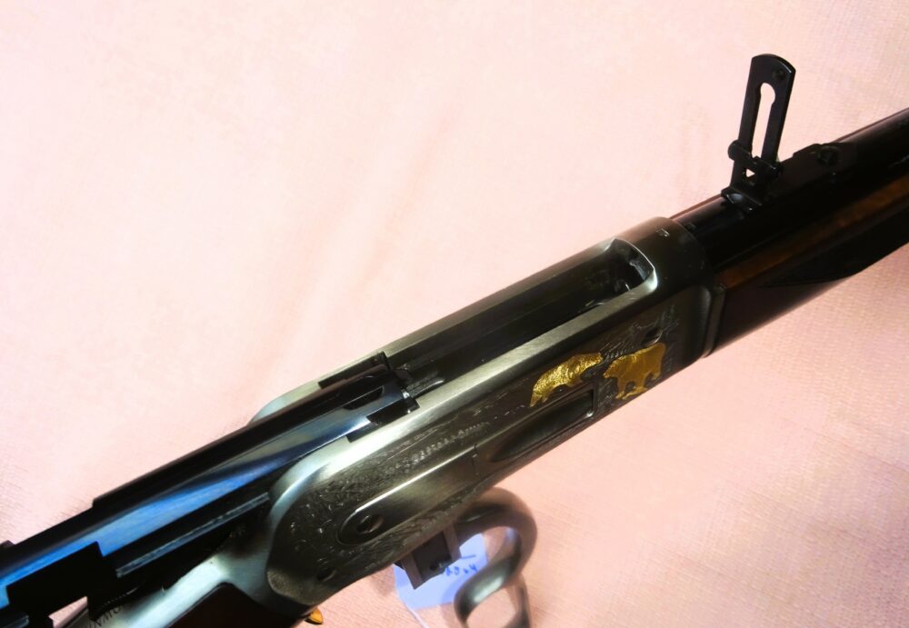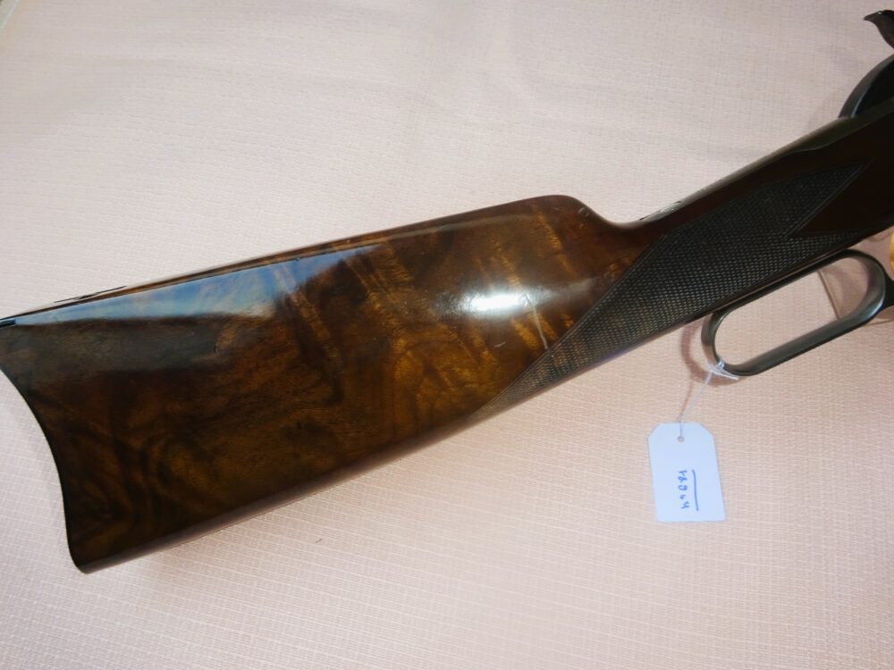 Carabine de selle model 1886, fabriquée par BROWNING, calibre 45/70 Gouv, canon rond de 22″ de longueur avec à l’intérieur des rayures état neuf, l’arme retient tout son bronzage à 100% sur le canon, le tube magasin, et la culasse, bien marqué du fabricant Browning : Arms Company Morgan UTAH et Montreal, le boîtier de culasse et le levier de chargement sont couleur acier brossé, finement gravé, avec réhaussés à l’or, 2 grizzly à droite et 2 cerfs à gauche de celui-ci, mécanique parfaite, (l’arme semble n’avoir jamais tirée), toutes les têtes de vis sont état neuf, superbes bois de luxe en loupe de noyer conservant tout leur verni d’origine avec un très beau quadrillage état neuf, arme fabriquée à 3 000 exemplaires seulement, très belle arme de collection et de tir au gros calibre.