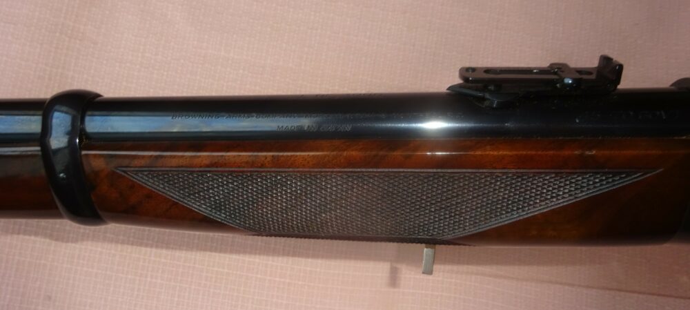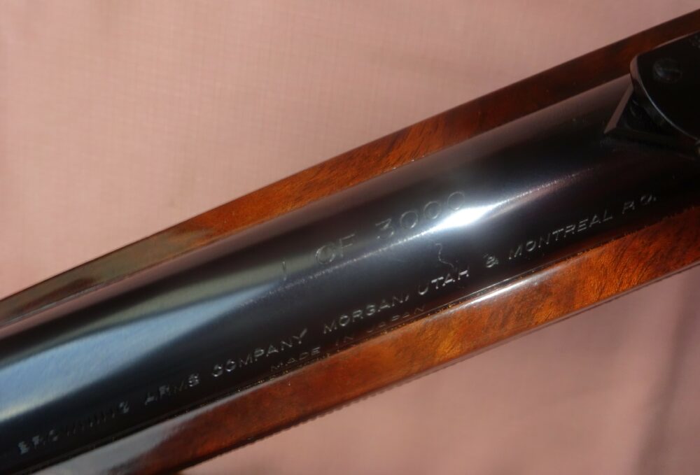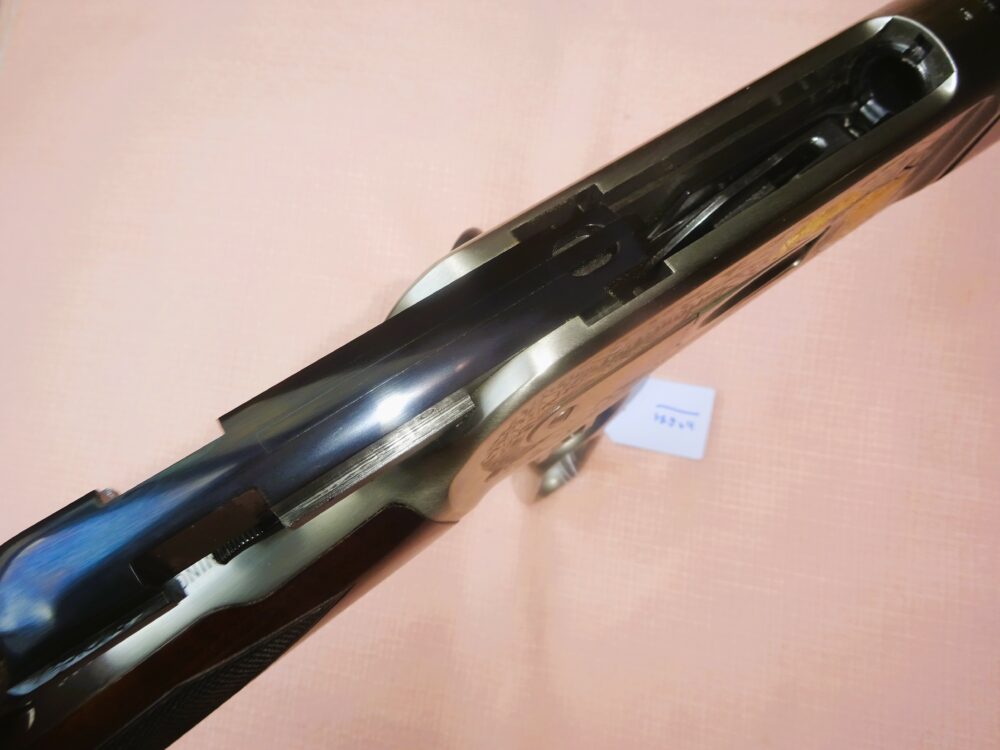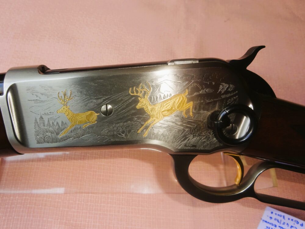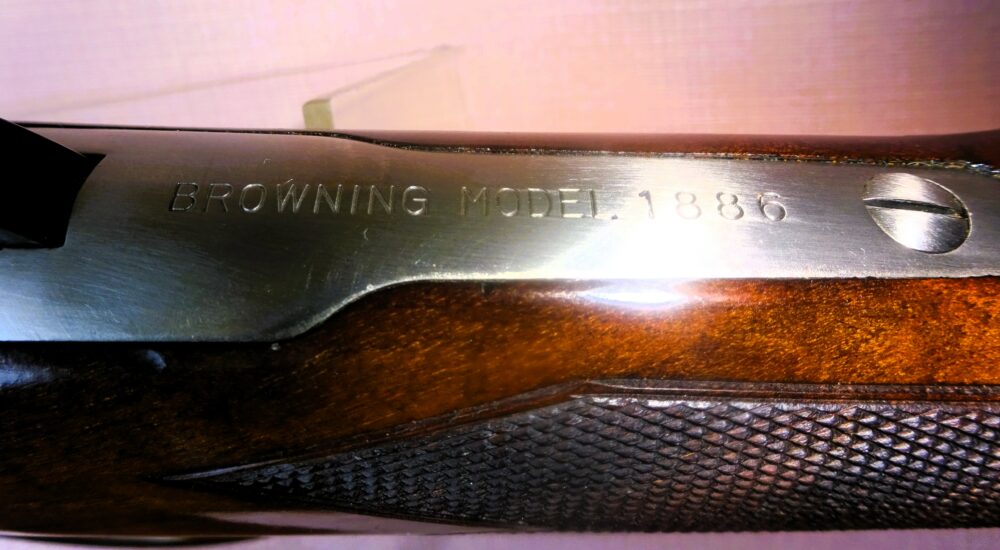 Carabine de selle model 1886, fabriquée par BROWNING, calibre 45/70 Gouv, canon rond de 22″ de longueur avec à l’intérieur des rayures état neuf, l’arme retient tout son bronzage à 100% sur le canon, le tube magasin, et la culasse, bien marqué du fabricant Browning : Arms Company Morgan UTAH et Montreal, le boîtier de culasse et le levier de chargement sont couleur acier brossé, finement gravé, avec réhaussés à l’or, 2 grizzly à droite et 2 cerfs à gauche de celui-ci, mécanique parfaite, (l’arme semble n’avoir jamais tirée), toutes les têtes de vis sont état neuf, superbes bois de luxe en loupe de noyer conservant tout leur verni d’origine avec un très beau quadrillage état neuf, arme fabriquée à 3 000 exemplaires seulement, très belle arme de collection et de tir au gros calibre.