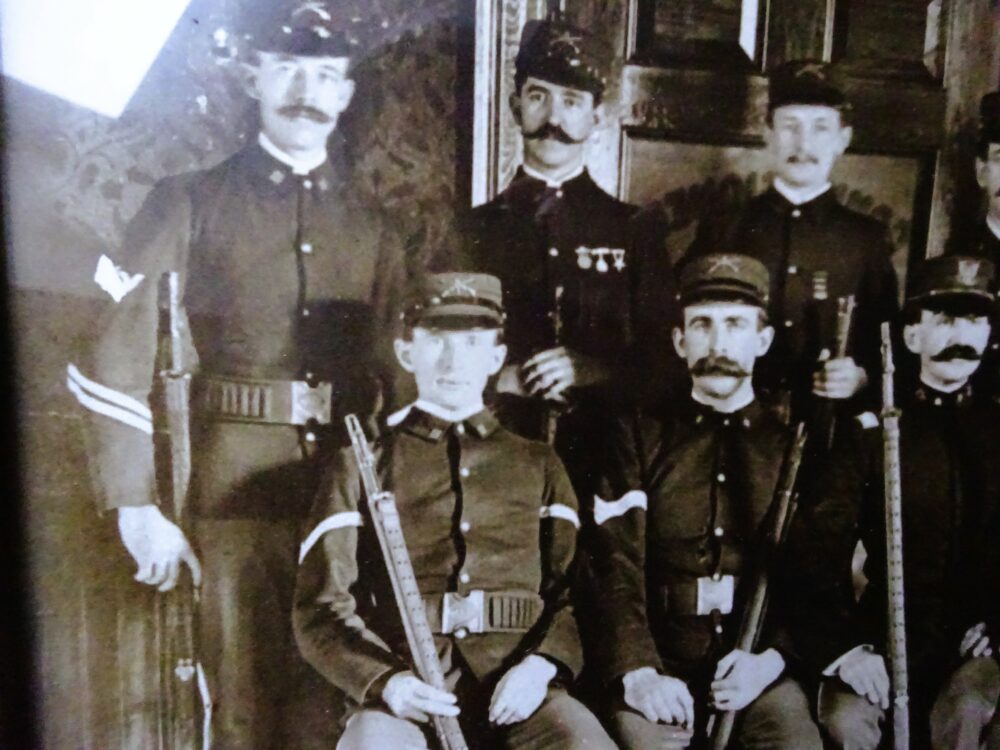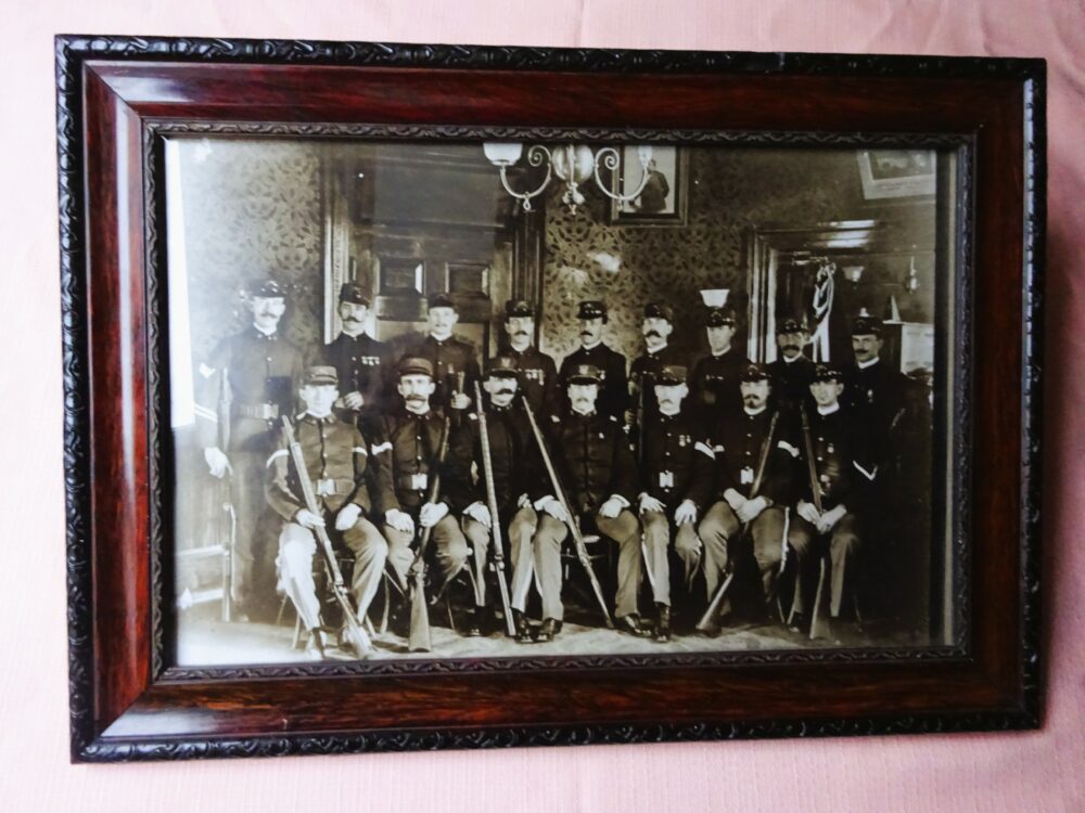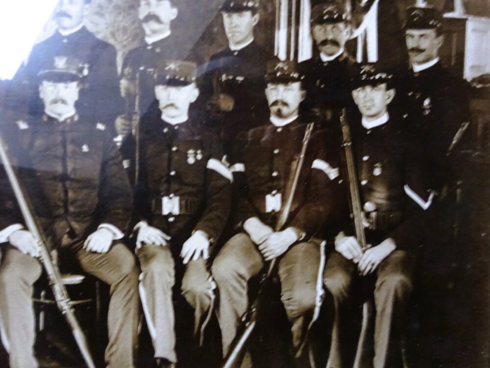 Superbe photo d’époque de la milice de New York, représentant un groupe hommes, tous armés de leur fusil Springield trapdoor, dans les années 1890, dans un très beau cadre ancien américain, de la même époque, document rare sur le marché, format encadré Ht 38cm, larguer 53cm.