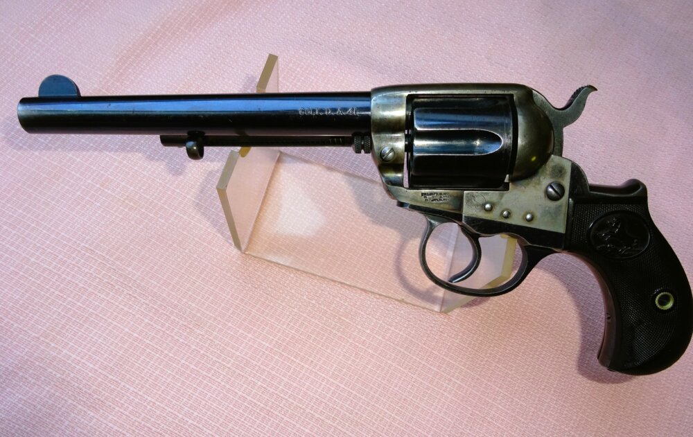 Revolver COLT LYCHTNING model 1877 (appelé aussi THUNDERER dans ce calibre), calibre 41 LC, 6 coups, canon rond de 6″ de longueur, à l’intérieur état neuf, l’arme retient 98% de son bleu brillant d’origine sur le canon, le barillet, l’extracteur et le pontet, 90% de son jaspage d’origine sur le bâti, toutes les têtes de vis sont état neuf avec encore leur bleu d’origine, mécanique parfaite sans aucun jeu à la percussion, beaux marquages sur 2 lignes sur le dessus du canon ainsi que les patents sur 3 lignes sur la gauche du bâti avec poulain colt, très belles plaquettes en gutta-percha avec poulain colt et quadrillage état neuf, arme fabriquée de 1877 à 1909, celui-ci est sorti de manufacture en 1903.