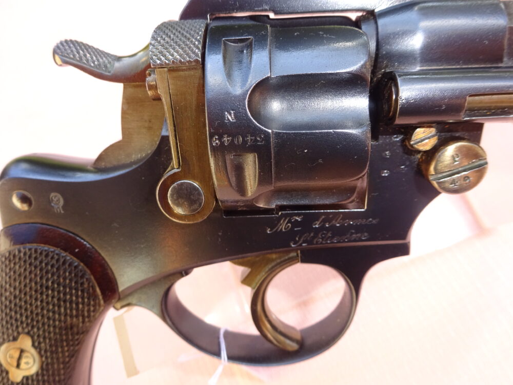 Revolver règlementaire français, modèle 1874, calibre 11 mm, 6 coups, canon semi-rond semi-octogonal de 11 cm de longueur, à l’intérieur état absolument neuf, avec des rayures bien saillantes, l’arme retient tout son bronzage à 100% sur l’ensemble et tout son jauni sur le chien, la queue de détente, axe de barillet, portière de chargement, marquages bien profonds de la Manufacture de St Etienne, tous les poinçons de contrôle présents, marquage du modèle sur la bande supérieure du canon, mécanique parfaite, bien franche sans aucun jeu au barillet ni d’entrefer, très belles têtes de vis, arme toutes aux mêmes numéros, superbe plaquettes de crosse avec quadrillage état neuf, arme sortie de manufacture en 1885.