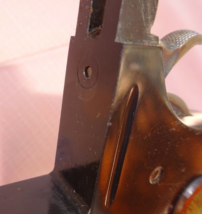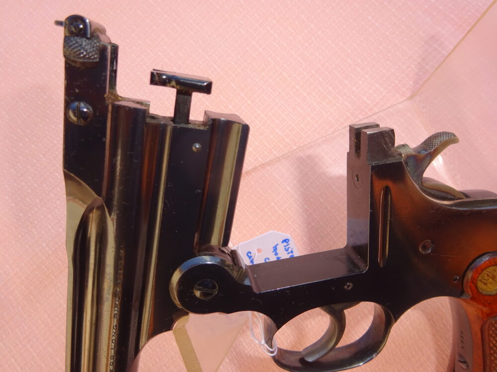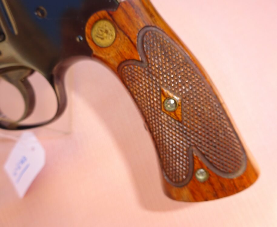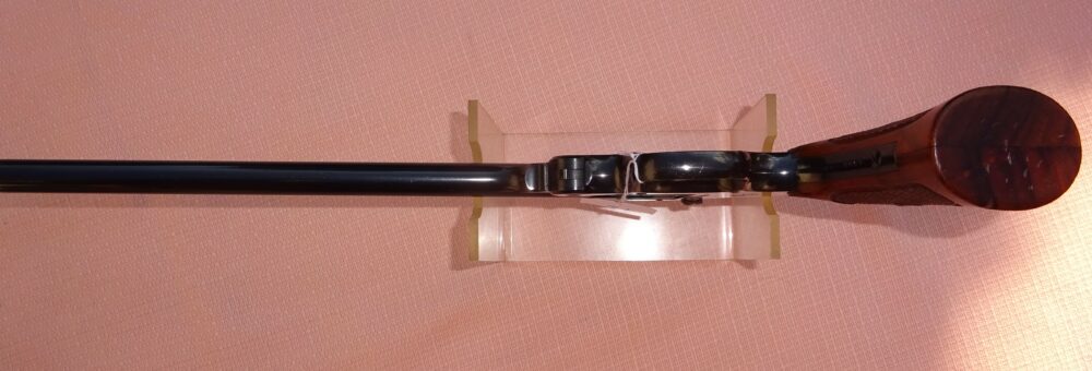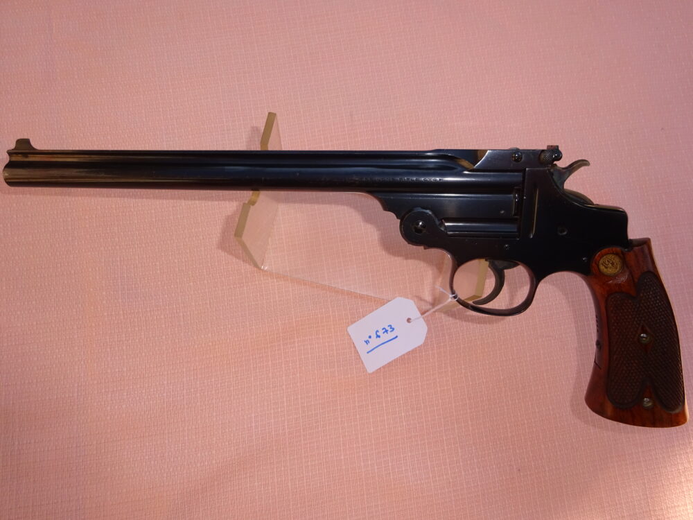 Pistolet SMITH & WESSON single shot, 3ème model, calibre 22 LR, 1 coup, canon rond de 10″ de longueur, à l’intérieur état neuf avec de très belles rayures bien saillantes, l’arme retient 100% de son bronzage d’origine sur l’ensemble et 100% de son jaspage coloré d’origine sur le chien et la queue de détente, marquages et patents sur 2 lignes sur la bande supérieure du canon et 22 LR à droite de celui-ci, très belles têtes de vis état neuf avec encore tout leur bleu d’origine, cran de mire et hausse target, mécanique parfaite, très belles plaquettes de crosse en noyer avec quadrillage état neuf avec insert S&W, belle arme de tir et de collection, arme produite à 6949 exemplaires, arme absolument état neuf d’usine, rare dans cet état.